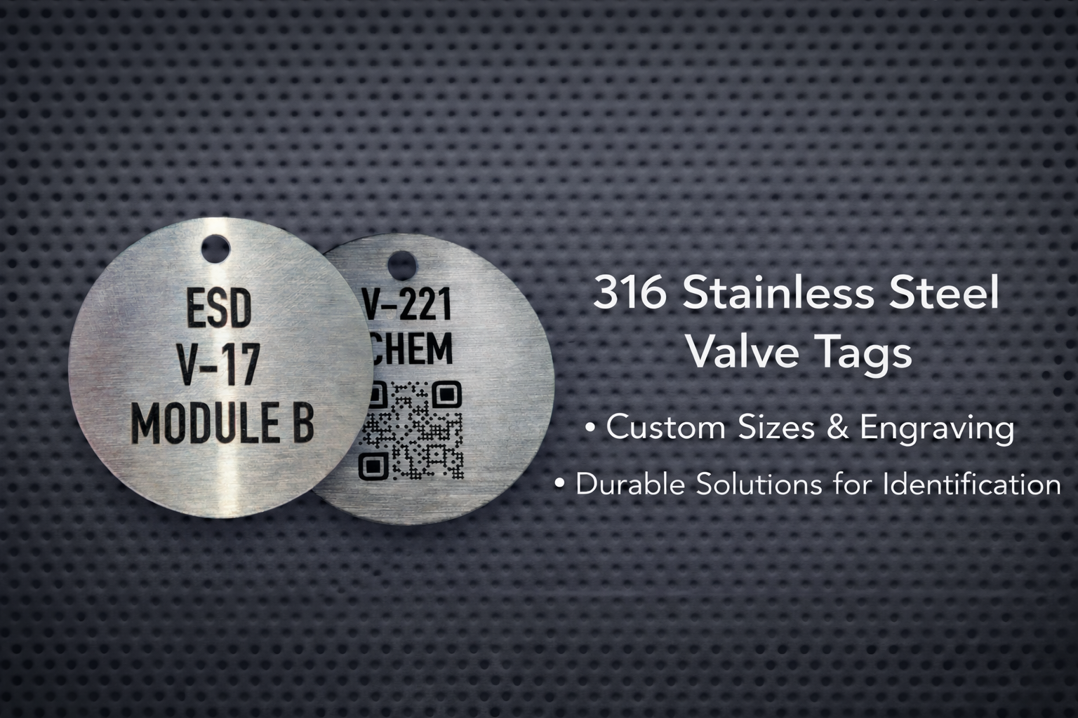 Premium 316 stainless steel valve tags designed for demanding industrial environments. These tags provide exceptional resistance to corrosion, chemicals, heat, saltwater and UV exposure. Perfect for valve identification, plant rooms, offshore and marine sites, HVAC systems, electrical panels, pumps, tools and mechanical equipment.